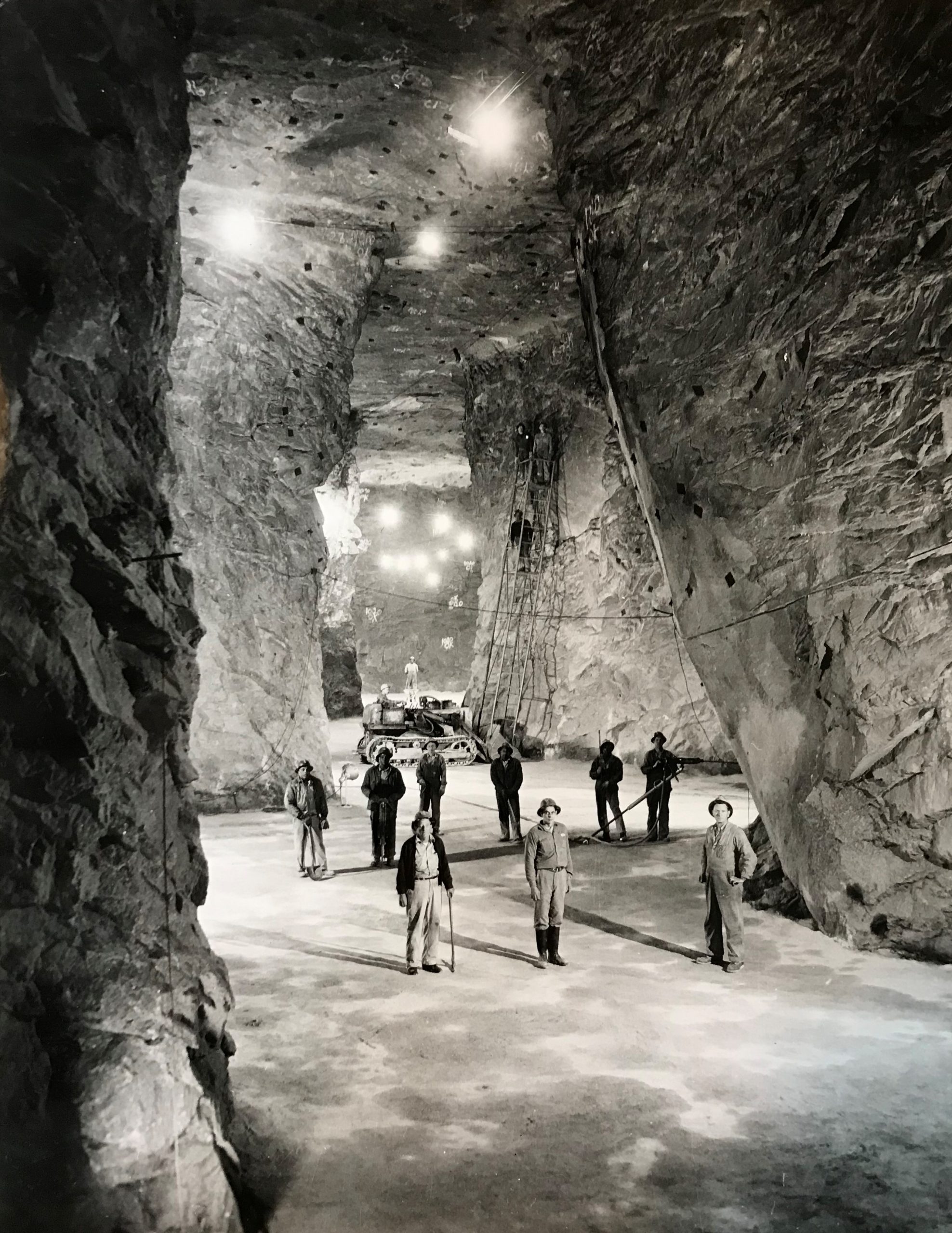 The caverns took years to build, with workers and broken rock entering and/or exiting through a five-foot-wide shaft. Mining equipment had to be lowered piece-by-piece through the shaft and reassembled inside the caverns.
